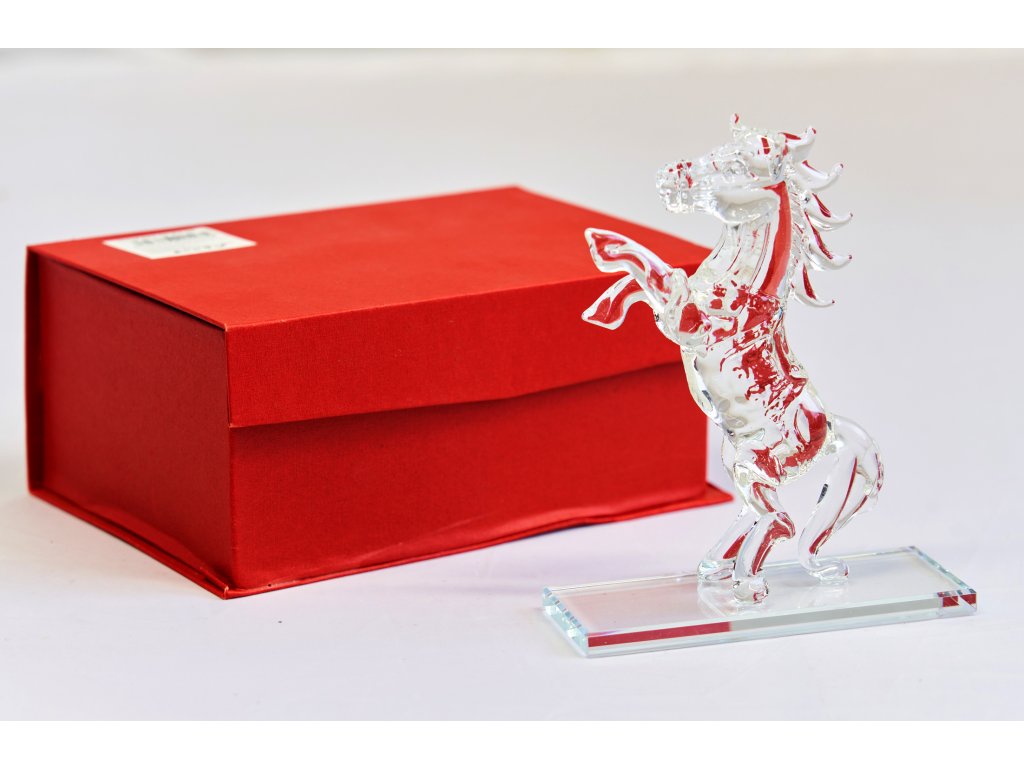 Skleněná soška ve tvaru vzpínajícího se koně. Čiré sklo. V dárkové kazetě.