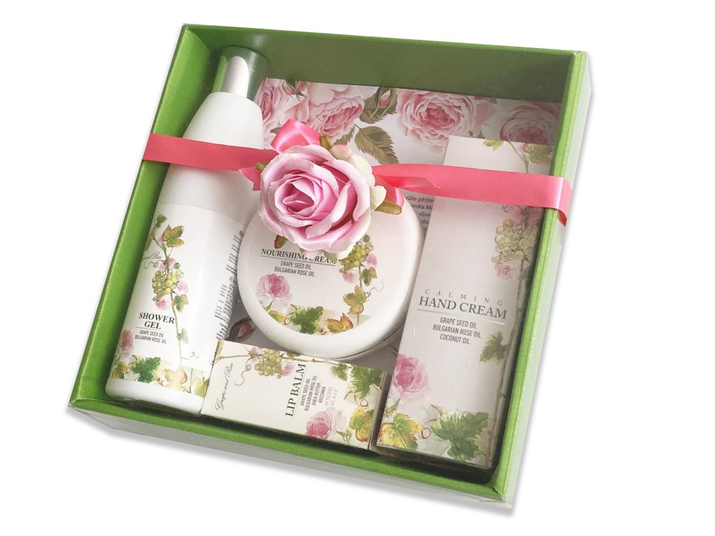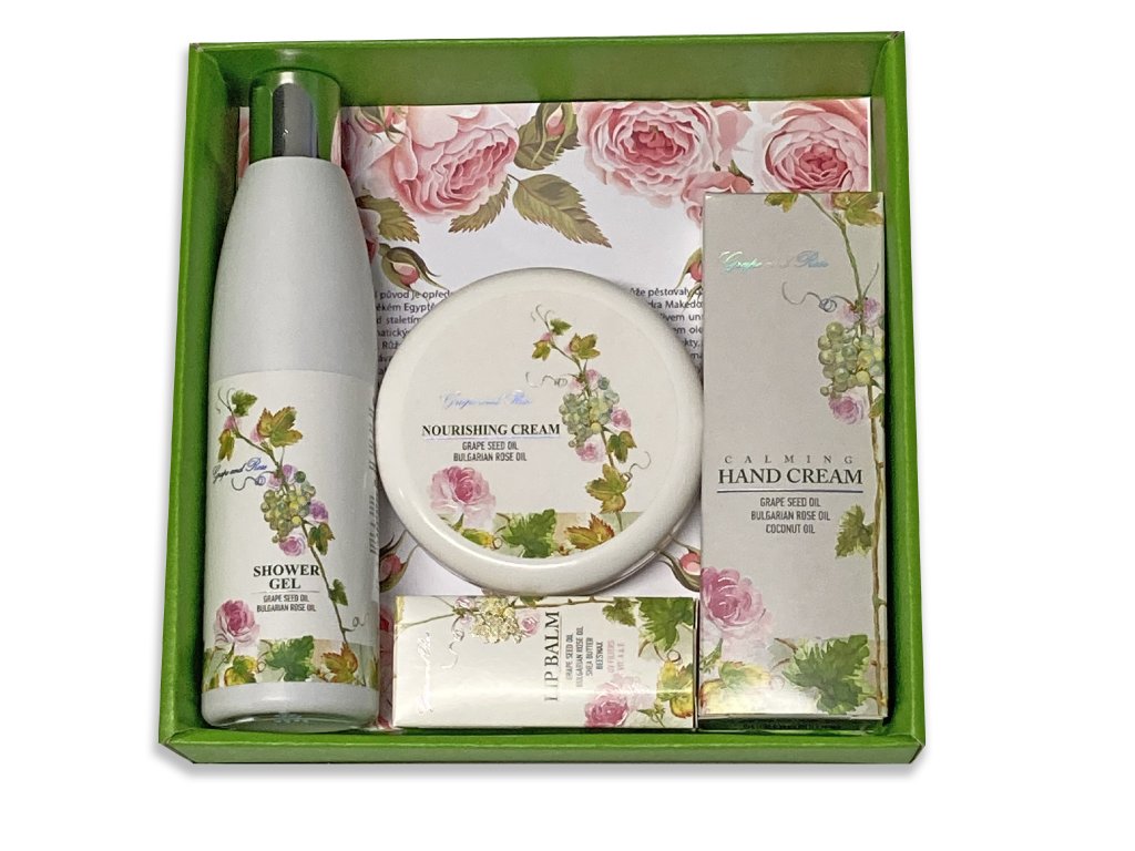 Tento dokonalý svěží balíček obsahuje hroznový olej a růže sprchový gel (250ml), vyživující krém (150ml), krém na ruce (75ml) a balzám na rty (5ml).