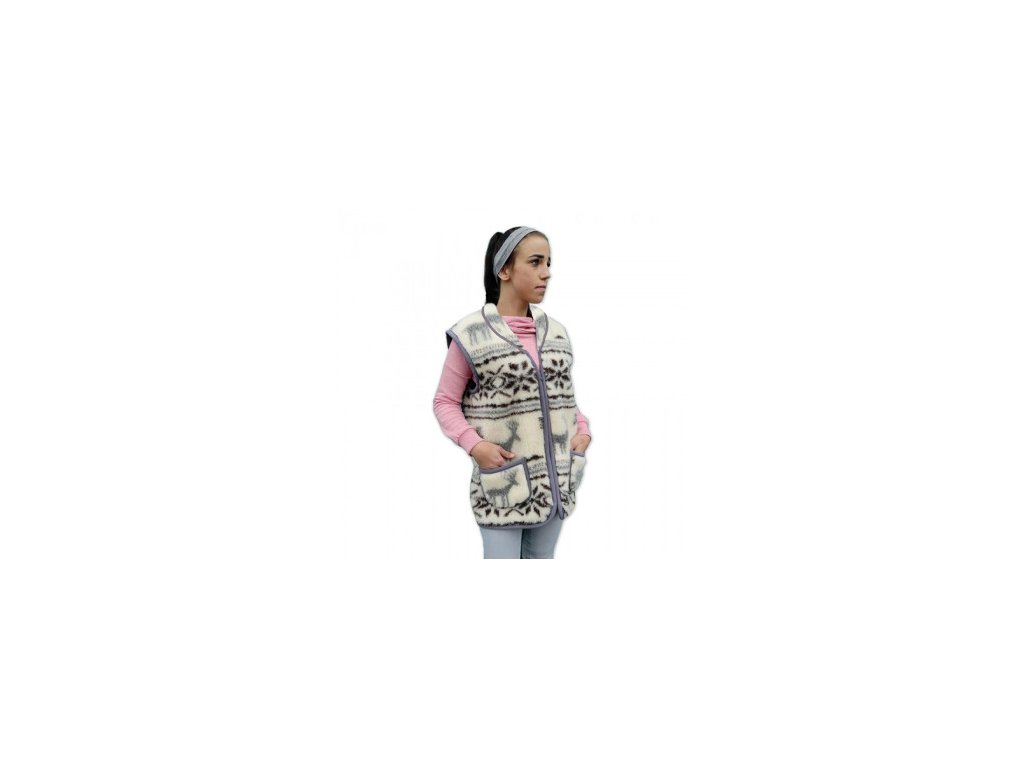 Vesta na zip s límečkem z ovčí vlny MERINO. Vesta s kapsami má moderní motiv norských sobů a zapínání na zips.