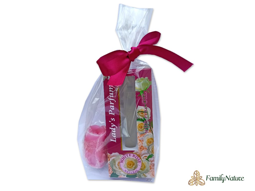 Tento dárkový balíček se skládá z jemného dámského parfému s obsahem růžového oleje (8ml) a glycerinového mýdla ve tvaru růžičky (35g).