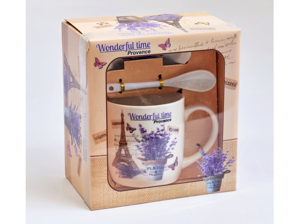 Porcelánový hrnek se lžičkou a podšálkem v dárkovém balení. Dekor levandule, Eiffelova věž.