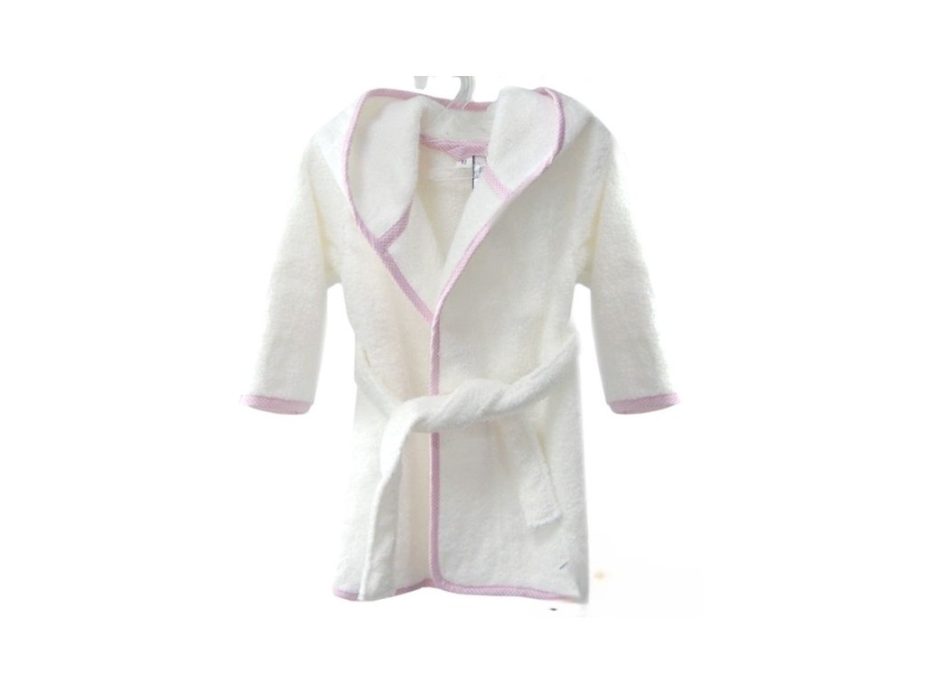 Měkoučký župan z čisté bavlny v bílé barvě s růžovým lemem. Sametově hebká látka pohladí dětskou pokožku a vdechne jí pocit tepla a pohodlí.
